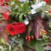 This beautiful double ended spray mixes red roses, red gerberas, freesias, carnations, alstra and berries with dusky blue eucalyptus, green and burgundy foliage’s. This design slightly flows out over as well as rounded over the top .